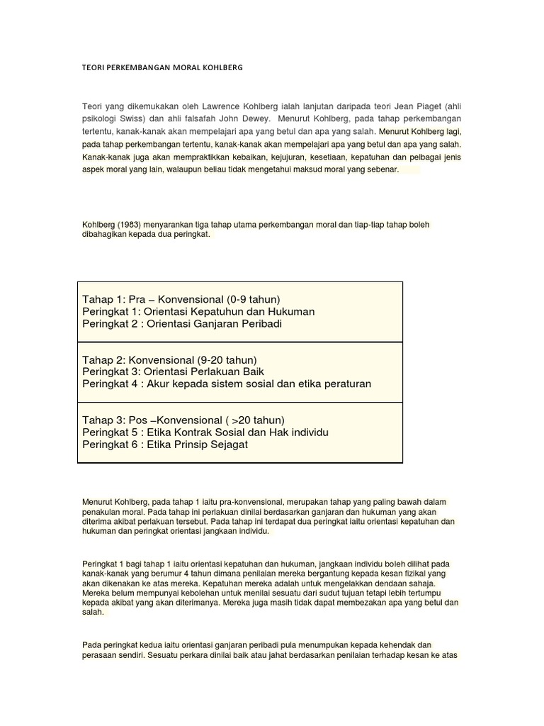 Teori perkembangan moral kohlberg yang dikemukakan oleh psikolog kohlberg menunjukan bahwa perbuatan moral bukan hasil sosialisasi atau pelajaran yang diperoleh dari kebiasaan dan hal hal lain yang berhubungan dengan norma kebudayaan (sunarto,2013:176). Tahapan tersebut dibuat saat ia belajar psikologi di university of chicago berdasarkan teori yang ia buat. Ia mengembangkan teori perkembangan moral alternatif berdasarkan norma perhatian (ethics of caring). Punishment and obedience orientation tahap ini disebut juga moralitas heteronomi. Pengkritik seperti christina hoff sommers. Lawrence kohlberg adalah salah satu murid dari jean piaget, dia menyempurnakan dan mengembangkan teori perkembangan moral yang telah dikemukakan oleh jean piaget. Pelumas, modikasi, dan penyempurna atas teori perkembangan. (2) terdapat sejumlah tahap pertimbangan moral yang sesuai dengan piaget; (1) penilaian dan perbuatan moral bersifat rasional; Teori perkembangan moral yang dirintis piaget ini. Suatu orientasi pada hukuman dan kepatuhan. Teori perkembangan moral kohlberg dipengaruhi oleh pemikiran jean piaget tentang model perkembangan. Makna perkembangan moral perkembangan sosial merupakan proses perkembangan kepribadian siswa selaku seorang anggota masyarakat dalam berhubungan dengan orang lain.